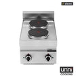 Entdecken Sie das hochwertige Elektrokochfeld mit 2 Brennern aus langlebigem Edelstahl AISI 304 (Stärke 8/10) mit einer Beschichtung AISI 430. Mit zwei 22 cm großen Gusseisenplatten , die jeweils von einem 2,6 kW-Heizelement angetrieben werden , sorgt es für schnelles und effizientes Kochen.