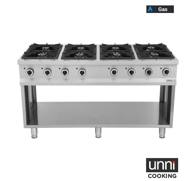 Der gewerbliche Gasherd von UnniCooking verfügt jetzt über verbesserte italienische Brenner für maximale Effizienz und Leistung. Mit 6,5 kW starken, überlappenden Doppelflammen liefert jeder Brenner intensive, konzentrierte Hitze – perfekt zum Grillen, Köcheln und Sautieren.
