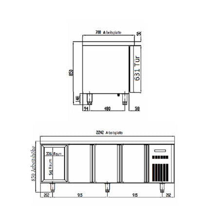TOPLINE Kühltisch / 4-fach GN1/1 mit 2 Schubladen / 3 Türen & Aufkantung, 2245 x 700 mm