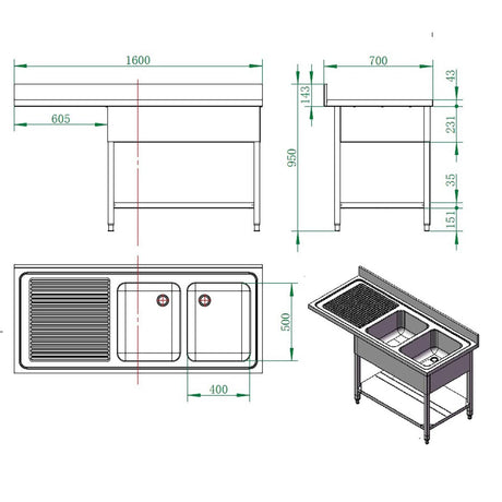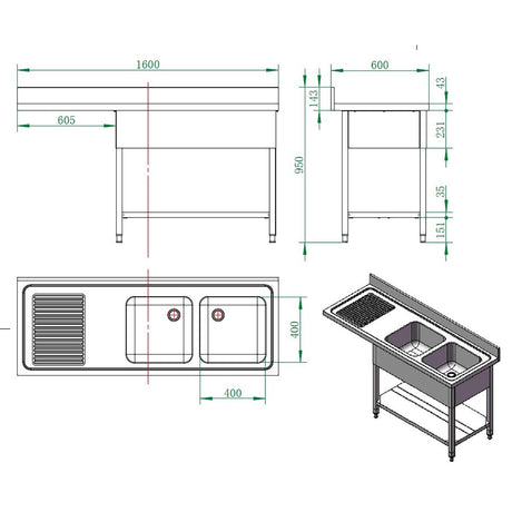Sofort lieferbar: 3 - 5 WerktageProfiline Spülzentrum mit 2 Becken links & Plattenüberstand - 1600 mm Breite