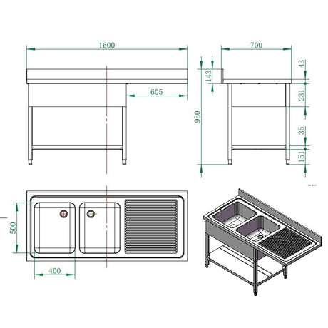 Sofort lieferbar: 3 - 5 Werktage EASYLINE Spülzentrum 600 / 2 Becken links B:1600