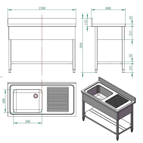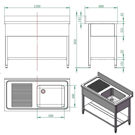 EASYLINE Spültisch 600 / 1 Becken links und Abtropffläche B:1200