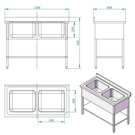 EASYLINE Spültisch 600 / 2 Becken B:1200