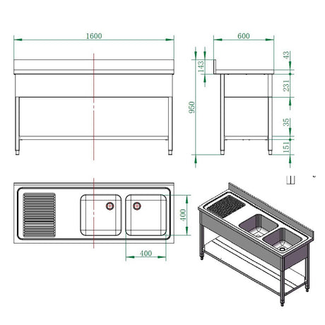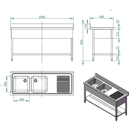 Sofort lieferbar: 3 - 5 WerktageProfiline Spültisch mit 2 Becken rechts und Abtropffläche - 600 mm