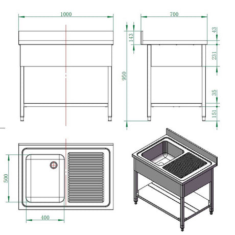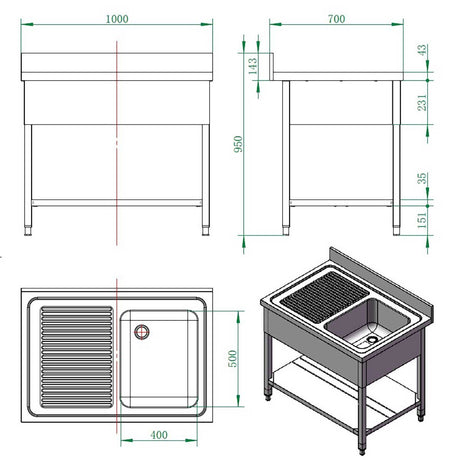 ECO Spültisch 100 x 70 x 85 cm - 1 Becken links