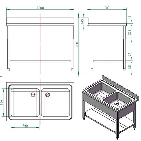 EASYLINE Spültisch 700 / 2 Becken B:1200