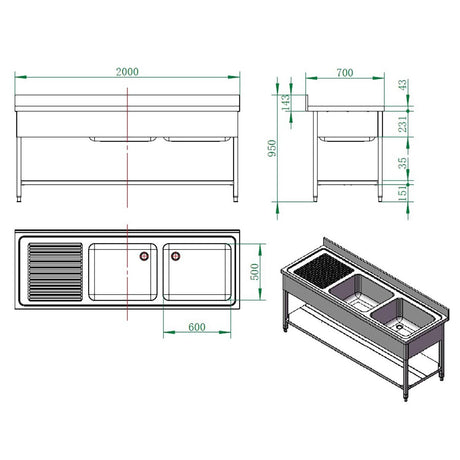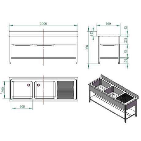 EASYLINE Spültisch 700 / 2 Becken links und Abtropffläche B:2000