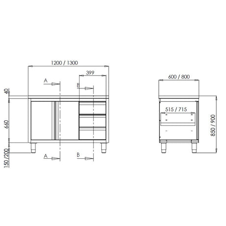 TOPLINE çalışma dolabı / kanatlı kapılar & sağda 3 çekmece , 1300 x 700 mm
